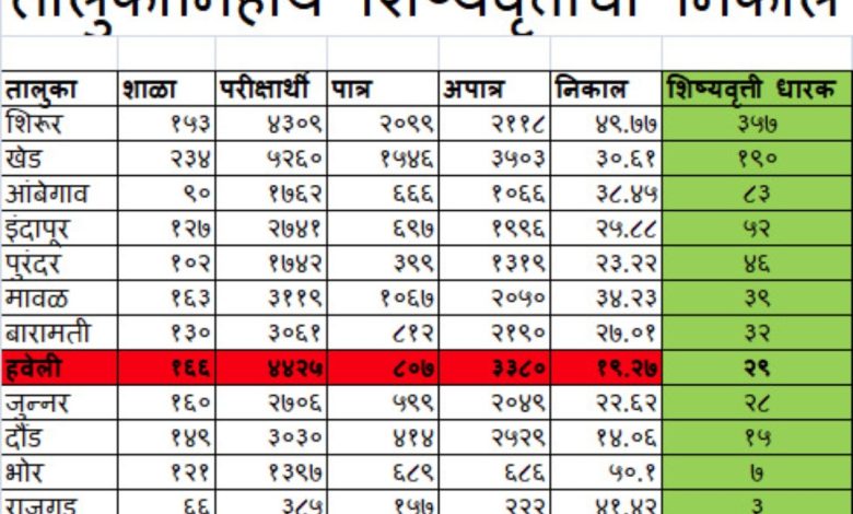 हवेली तालुक्यातून शिष्यवृत्ती परीक्षेसाठी ४,४२५ विद्यार्थी बसले होते. यामध्ये केवळ ८०७ विद्यार्थी उत्तीर्ण झाले असून त्यापैकी फक्त २९ विद्यार्थ्यांना शिष्यवृत्ती मंजूर झाली आहे. म्हणजेच तब्बल ३,३८० विद्यार्थी परीक्षेत अपात्र ठरले. दरवर्षीप्रमाणे यंदाही शिरूर, खेड आणि आंबेगाव तालुक्यांनी गुणवत्तेच्या यादीत वरचे स्थान कायम ठेवले आहे.