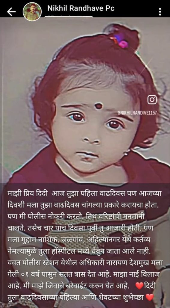 रणदिवे यांनी लिहिलेली पोस्ट अत्यंत वेदनादायी असून त्यातून पोलिस कर्मचारी झालेल्या मानसिक त्रासाचे जिवंत चित्र उमटते. त्यांनी म्हटले आहे, “दिदी, आज तुझा पहिला वाढदिवस… मला तुझ्यासोबत साजरा करायचा होता. पण मी पोलीस आहे, येथे वरिष्ठांची मनमानी चालते. तू आजारी असताना मला जबरदस्ती नाशिक, जळगाव, अहमदनगर येथे पाठवले गेले, तुला हॉस्पिटलला घेऊन जाण्यासही मिळाले नाही. यवत पोलीस स्टेशनचे अधिकारी नारायण देशमुख मला वर्षभर त्रास देत आहेत. माझा नाविलाज झाला आहे. मी माझ्या जीवाचे बरेवाईट करत आहे. ही तुझ्यासाठी पहिली आणि शेवटची शुभेच्छा.”