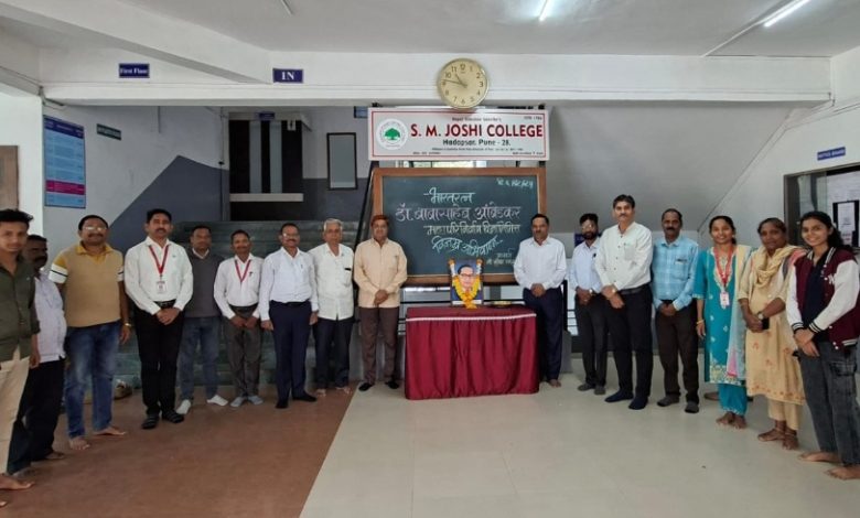 हडपसर (पुणे) : दि. ६ डिसेंबर २०२५ एस. एम. जोशी महाविद्यालयात भारतरत्न डॉ. बाबासाहेब आंबेडकर यांच्या महापरिनिर्वाण दिनानिमित्त श्रद्धांजली कार्यक्रम अत्यंत शांत, संयत आणि भावपूर्ण वातावरणात पार पडला. महाविद्यालयाचे प्राचार्य डॉ. सुरेश साळुंखे यांच्या मार्गदर्शनाखाली आयोजित या कार्यक्रमाची सुरुवात डॉ. आंबेडकरांच्या प्रतिमेच्या पूजनाने झाली. विद्यार्थ्यांसह प्राध्यापक, शिक्षकेतर कर्मचारी आणि स्वयंसेवकांनी मोठ्या आदराने बाबासाहेबांना अभिवादन केले. महाविद्यालयात दरवर्षीप्रमाणे यावर्षीही या स्मृतिदिनाचे औचित्य साधून सामाजिक बांधिलकीवर भर देणारे उपक्रम राबविण्यात आले.