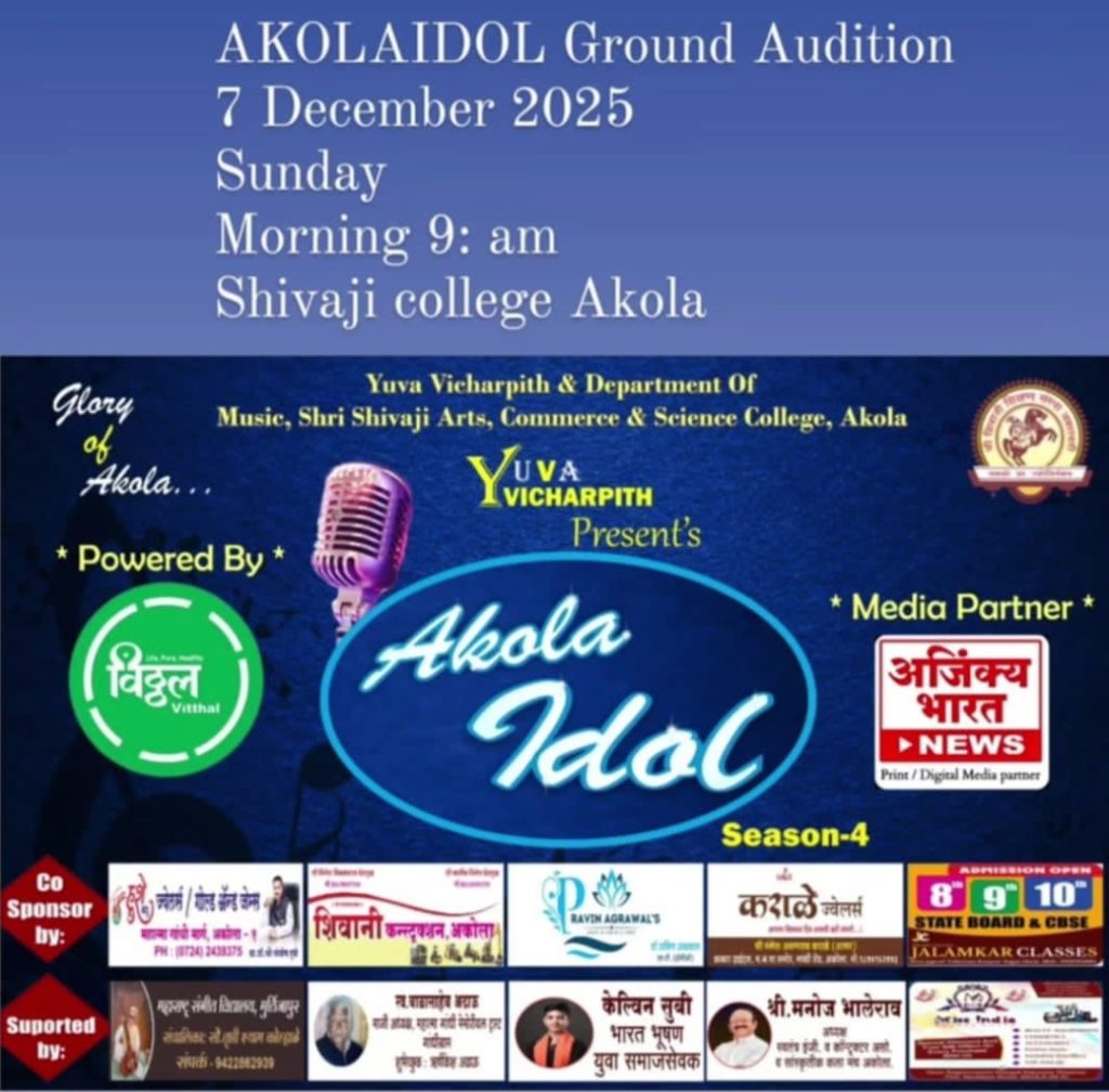 या सर्व स्पर्धकांसाठी ऑडिशन दिनांक 07 डिसेंबर 2025 (रविवार) रोजी सकाळी 9 वाजता श्री शिवाजी कला, वाणिज्य व विज्ञान महाविद्यालय, अकोला येथे आयोजित करण्यात आले आहेत.