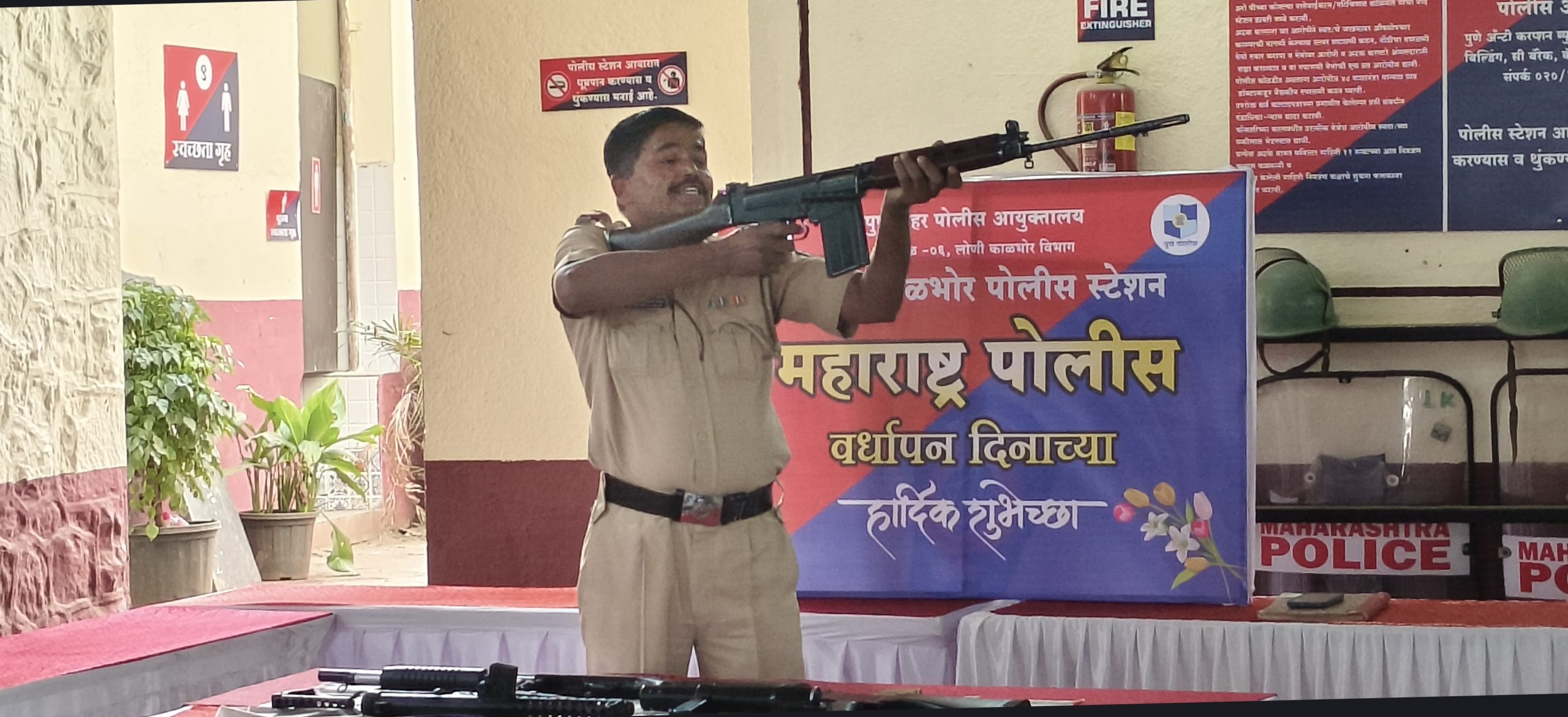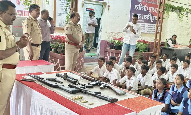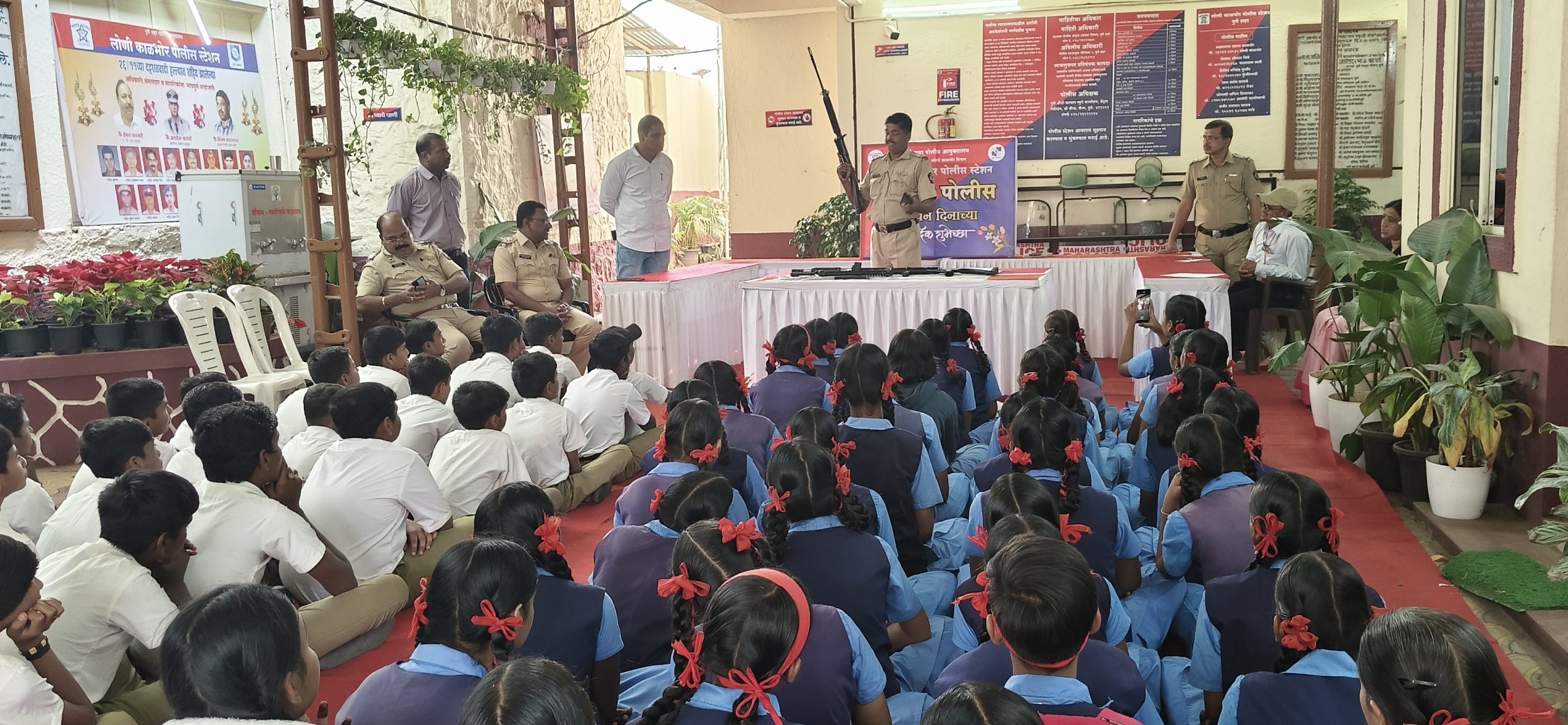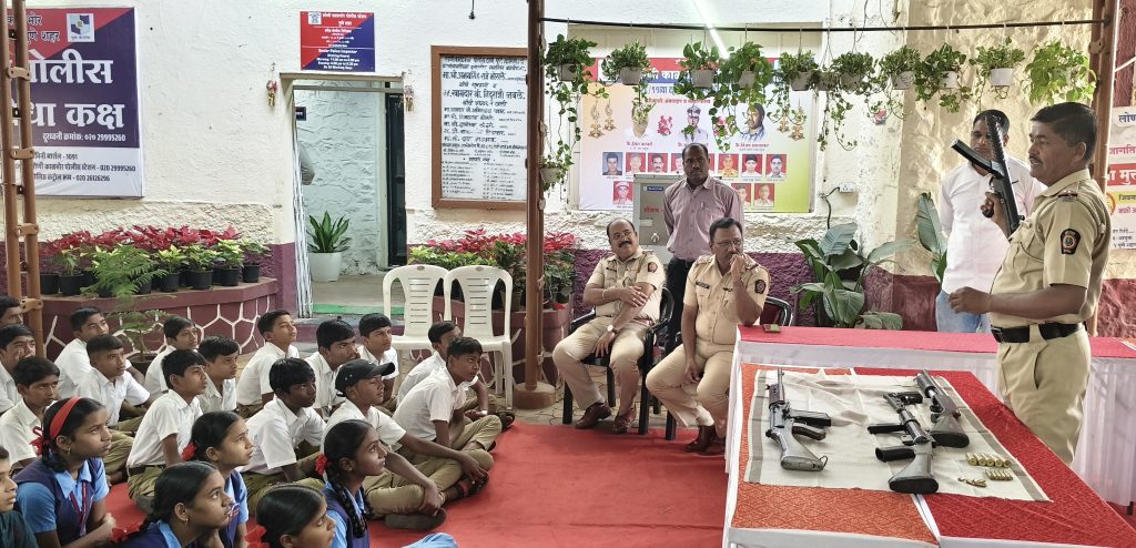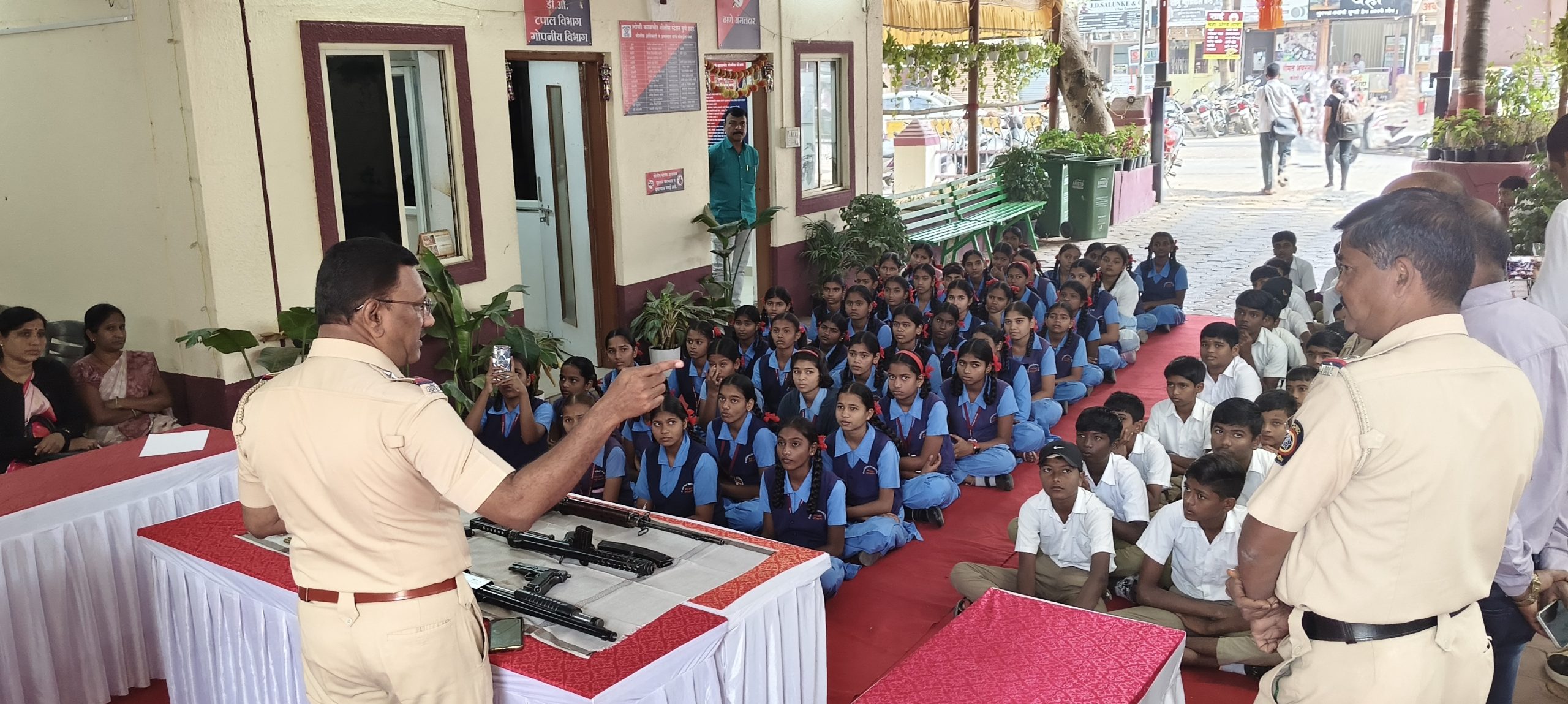 यावेळी सहाय्यक पोलीस निरीक्षक तानाजी भापकर यांनी पोलीस स्टेशनमध्ये उपलब्ध असलेल्या बंदुका व रायफल्सची माहिती, त्यांची रेंज, वापराची पद्धत, शस्त्र हाताळताना घ्यावयाची सुरक्षितता आणि शस्त्रांचा वापर केवळ कायद्याच्या चौकटीतच कसा केला जातो, याचे प्रात्यक्षिकाद्वारे सविस्तर मार्गदर्शन केले. विद्यार्थ्यांनी शस्त्रांविषयी अनेक प्रश्न विचारत मोठी उत्सुकता दाखवली.