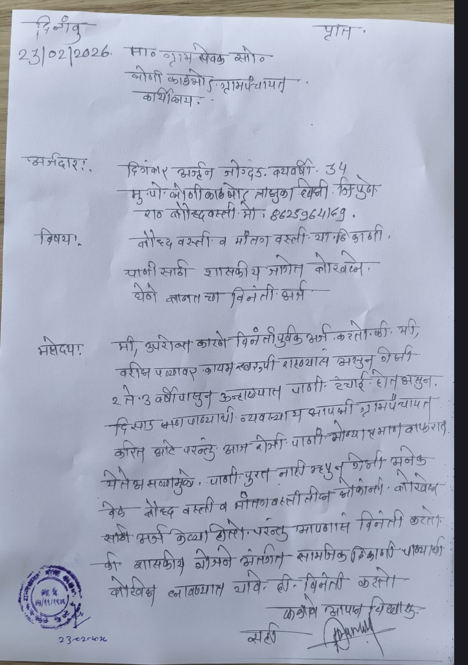 अर्जदार दिगंबर अर्जुन जोगदंड यांनी दिलेल्या निवेदनात नमूद केले आहे की, ते संबंधित परिसरात कायमस्वरूपी वास्तव्यास असून गेल्या काही वर्षांपासून उन्हाळ्याच्या काळात पाण्याची तीव्र कमतरता जाणवत आहे. सध्या ग्रामपंचायतीमार्फत दोन दिवसाआड पाणीपुरवठा केला जात असला तरी तो अत्यंत अपुरा ठरत आहे. विशेषतः महिलांना व ज्येष्ठ नागरिकांना पाण्यासाठी मोठी पायपीट करावी लागत असून दैनंदिन जीवन विस्कळीत होत आहे.