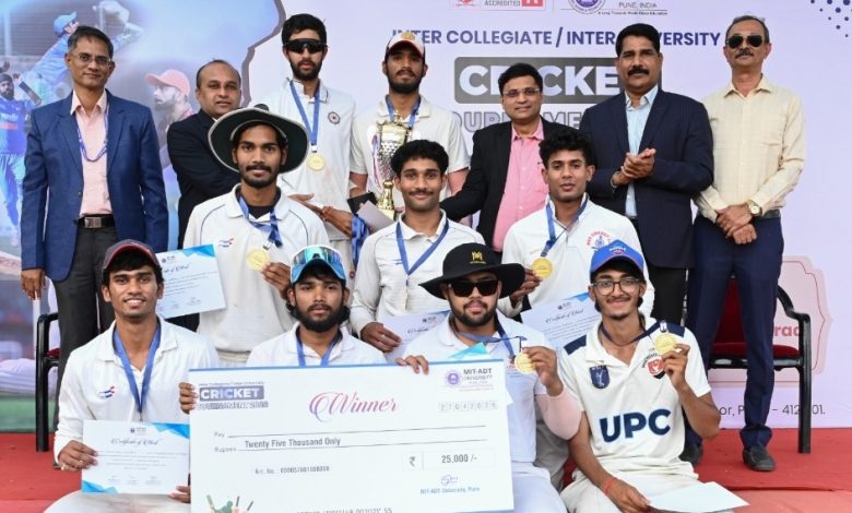 कदमवाकवस्ती (ता. हवेली) : लोणी काळभोर येथे एमआयटी आर्ट, डिझाईन अँड टेक्नॉलॉजी (एमआयटी-एडीटी) विद्यापीठात रंगलेल्या आंतरमहाविद्यालयीन क्रिकेट स्पर्धेत अजिंक्य डी. वाय. पाटील विद्यापीठ, लोहगाव (पुणे) संघाने दमदार कामगिरी करत विजेतेपद पटकावले. अंतिम सामन्यात त्यांनी एमआयटी कॉलेज ऑफ मॅनेजमेंट (मिटकॉम), लोणी काळभोर संघावर ४१ धावांनी मात करत स्पर्धेवर आपली मोहोर उमटवली.