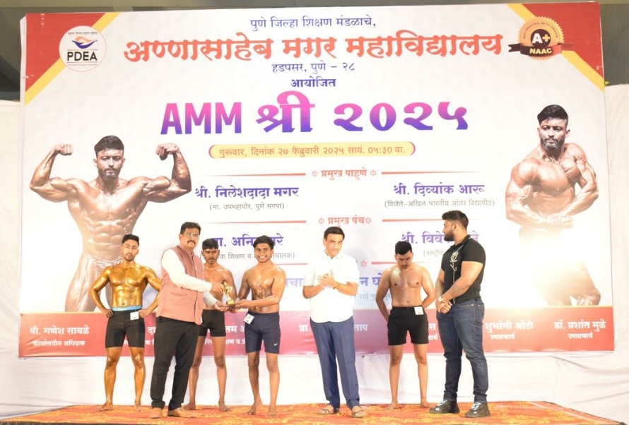 पुणे (हडपसर) : पुणे जिल्हा शिक्षण मंडळाचे अण्णासाहेब मगर महाविद्यालय आयोजित ‘एएमएम क्लासिक सिनियर श्री – २०२५’ चा ‘किताब शिवम वडार याने ‘एएमएम क्लासिक जुनिअर श्री – २०२५’ चा किताब कृष्णा फडतरे याने प्राप्त केला.