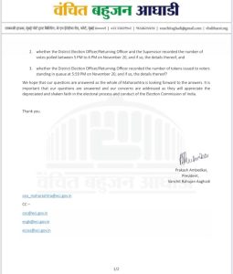 या पत्रात प्रकाश आंबेडकर यांनी तीन प्रश्न विचारले आहेत. मतदाराला त्याचे/तिचे/त्यांचे मत देण्यासाठी लागणारा वेळ किती? जिल्हा निवडणूक अधिकारी/रिटर्निंग अधिकारी आणि पर्यवेक्षक यांनी २० नोव्हेंबर रोजी सायंकाळी ५ ते संध्याकाळी ६ या वेळेत झालेल्या मतांची नोंद केली आहे का? आणि असल्यास, त्याचा तपशील काय?; जिल्हा निवडणूक अधिकारी/रिटर्निंग ऑफिसर यांनी २० नोव्हेंबर रोजी सायंकाळी ५:५९ वाजता रांगेत उभ्या असलेल्या मतदारांना जारी केलेल्या टोकनची संख्या नोंदवली आहे का आणि असल्यास, त्याचा तपशील काय? असे तीन प्रश्न प्रकाश आंबेडकर यांनी उस्थित केले आहेत.