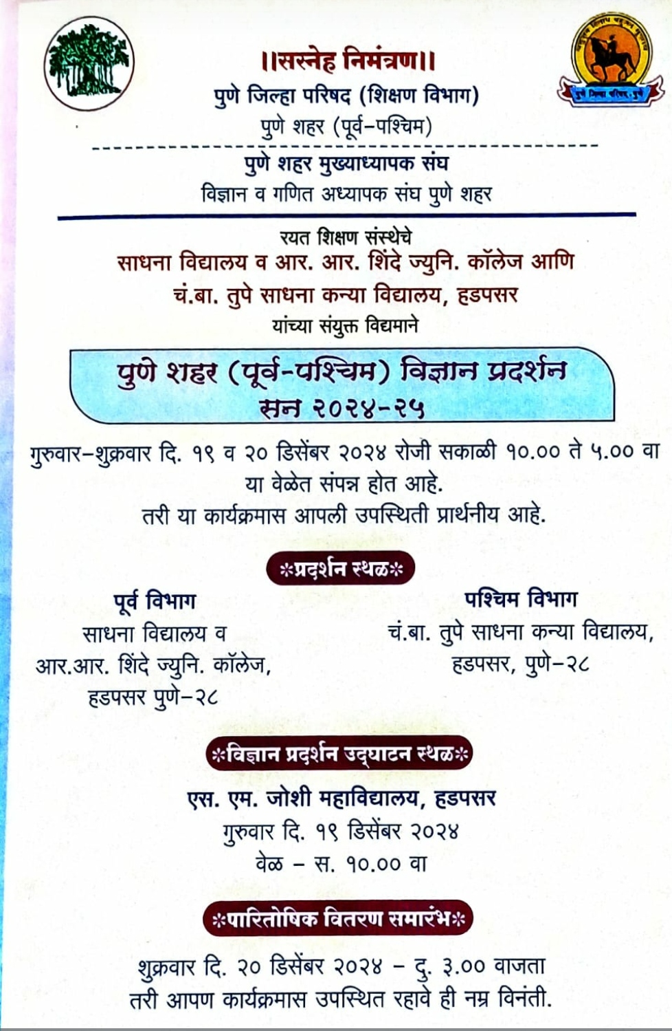 पुणे (हडपसर) : पुणे जिल्हा परिषद (शिक्षण विभाग) , पुणे शहर मुख्याध्यापक संघ, पुणे शहर विज्ञान व गणित अध्यापक संघ, साधना विद्यालय व आर.आर शिंदे ज्युनियर कॉलेज व चं.बा.तुपे साधना कन्या विद्यालय हडपसर यांच्या संयुक्त विद्यमाने २०२४-२०२५ या शैक्षणिक वर्षातील पुणे शहर पूर्व – पश्चिम विभाग, तालुका पातळीवरील विज्ञान प्रदर्शन साधना विद्यालय व आर. आर शिंदे ज्युनियर कॉलेज व चं.बा.तुपे साधना कन्या विद्यालयामध्ये दि.19 डिसेंबर व २० डिसेंबर २०२४ रोजी आयोजित करण्यात आलेले आहे.