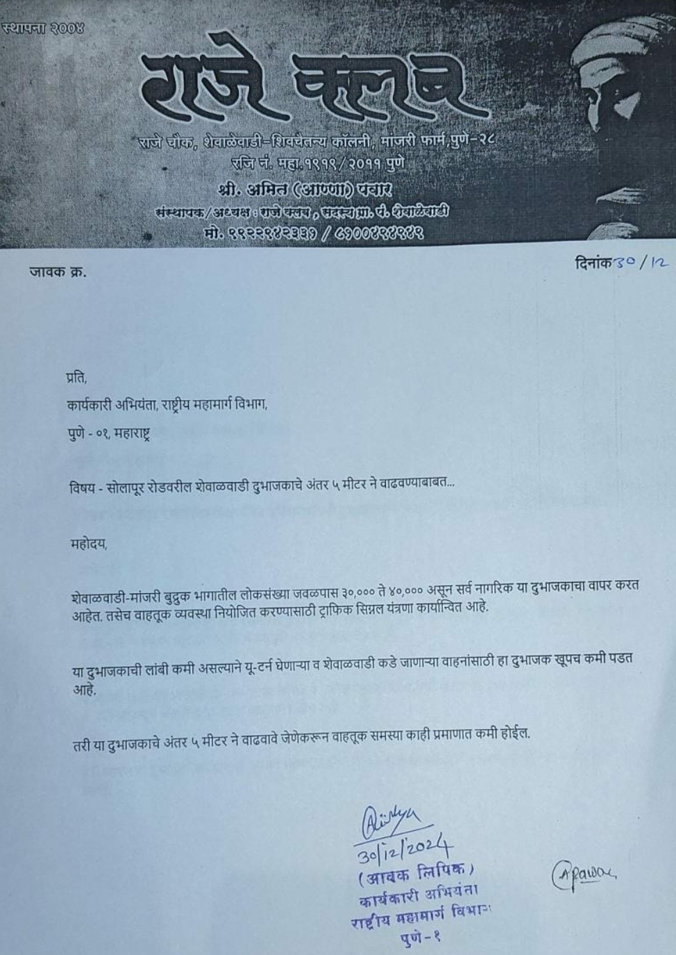 पाठीमागील काही दिवसात शेवाळवाडी भारत पेट्रोल पम्पां समोरील दुभाजक बंद केल्याने सर्व नागरिकांना शेवाळवाडी चौकामध्ये यू-टर्न घेण्यासाठी यावे लागते. या दुभाजकाचे अंतर यु-टर्न घेताना कमी असल्याने या ठिकाणी प्रचंड वाहतूक कोंडी होत आहे. यावर उपाय योजना म्हणून राजे क्लबच्या वतीने या दुभाजकाचे अंतर (शासन नियमानुसार ५ मीटर) ने वाढवावे अशा मागणीचे पत्र राष्ट्रीय महामार्ग अभियंत्या श्रुती नाईक याना देण्यात आले.