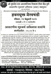 पुणे : श्री गुरुदेव दत्त अध्यात्मिक विकास सेवा केंद्र पुण आदरणीय गुरुवर्य अविनाश (दादा) बडगुजर यांच्या माध्यमातून ऑनलाइन स्वामी सेवेचा झेंडा रोवणाऱ्या श्री गुरुदेव दत्त भक्त परिवाराचा हवनयुक्त भैरवचंडी रविवार, १६ फेब्रुवारी २०२५ सकाळी ८ ते १२ वाजेपर्यंत आदरणीय गुरुवर्य अविनाश दादांचे मार्गदर्शन : १२.११ ते २ वेळेत संपन्न होणार. (स्थळः श्री वरद सिद्धी विनायक सेवा भवन, भोपर रोड, डोंबिवली पूर्व ४२१२०४) येथे संपन्न होणार आहे.