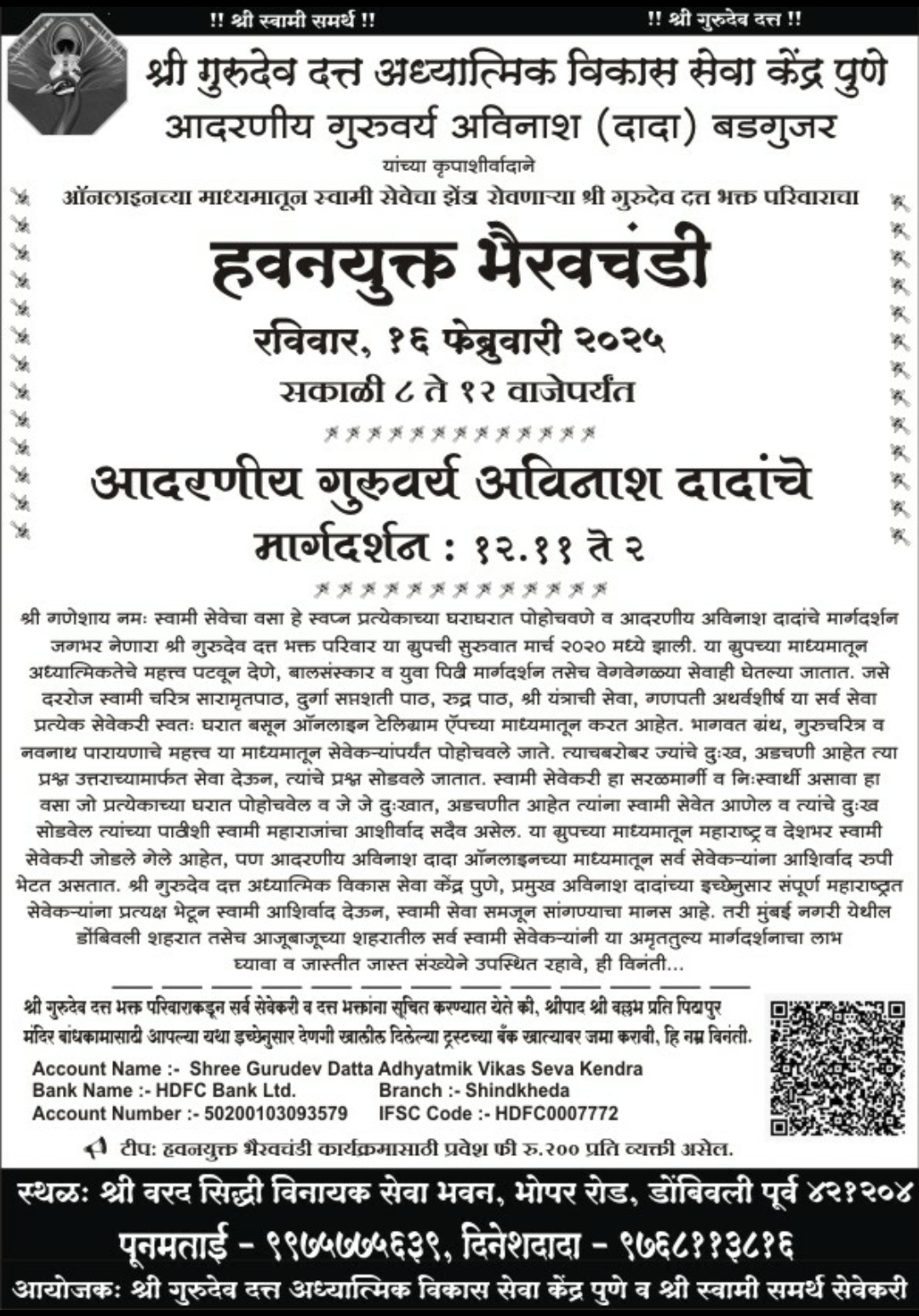 या ग्रुपच्या माध्यमातून महाराष्ट्र व देशभर स्वामी सेवेकरी जोडले गेले आहेत, पण आदरणीय अविनाश दादा ऑनलाइनच्या माध्यमातून सर्व सेवेकऱ्यांना आशिर्वाद रुपी भेटत असतात. श्री गुरुदेव दत्त अध्यात्मिक विकास सेवा केंद्र पुणे, प्रमुख अविनाश दादांच्या इच्छेनुसार संपूर्ण महाराष्ट्रत सेवेकऱ्यांना प्रत्यक्ष भेटून स्वामी आशिर्वाद देऊन, स्वामी सेवा समजून सांगण्याचा मानस आहे. तरी मुंबई नगरी येथील डोंबिवली शहरात तसेच आजूबाजूच्या शहरातील सर्व स्वामी सेवेकऱ्यांनी या अमृततुल्य मार्गदर्शनाचा लाभ घ्यावा, हवनयुक्त भैरवचंडी कार्यक्रमासाठी प्रवेश फी रु. २०० प्रति व्यक्ती असेल. व जास्तीत जास्त संख्येने उपस्थित रहावे, असे आवाहन श्री गुरुदेव दत्त भक्त परिवाराकडून करण्यात आले आहे.
