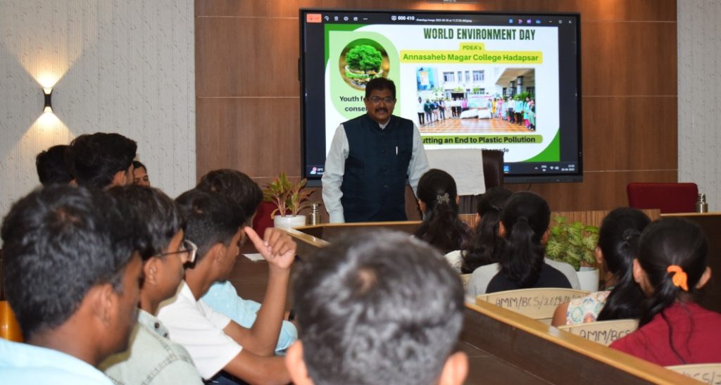 पुणे ( हडपसर) : विद्यार्थ्यांमध्ये पर्यावरण संवर्धनाची जाण निर्माण व्हावी या उद्देशाने पुणे जिल्हा शिक्षण मंडळाच्या अण्णासाहेब मगर महाविद्यालयात राष्ट्रीय सेवा योजना विभागाच्या वतीने जागतिक पर्यावरण दिनानिमित्त विविध उपक्रमांचे आयोजन करण्यात आले.