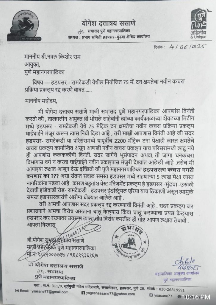 याबाबत तत्कालीन आयुक्त भोसले यांनी त्यांच्या कार्यकाळाच्या शेवटच्या मिटींग मध्ये हडपसर – रामटेकडी येथे ७५ मेट्रिक टन क्षमतेचा नवीन कचरा प्रक्रिया प्रकल्प घाईघाईने मंजूर करून त्यास निधी दिला आहे , तरी याबाबत माझी आपणास विनंती आहे की या हडपसर- रामटेकडी या परिसरामध्ये यापूर्वीच २२०० मॅट्रिक टना पेक्षाही जास्त क्षमतेचे कचरा प्रकल्प कार्यान्वित असून आणखी नवीन कचरा प्रकल्प याच परिसरामध्ये लादु नये ही आपणांस विनंती. असे निवेदनात योगेश दत्तात्रय ससाणे यांनी म्हटले आहे.