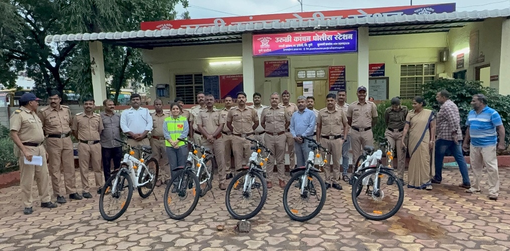 उरुळी कांचन (पुणे) : उरुळी कांचन पोलीस स्टेशन हद्दीत नागरिकांच्या सुरक्षिततेसाठी आणि पोलीस-जनता सुसंवाद अधिक मजबूत करण्यासाठी सायकल पेट्रोलिंग उपक्रम सुरू करण्यात आला आहे. अल्ट्राटेक सिमेंट कंपनीच्या सामाजिक उपक्रमांतर्गत पोलीस स्टेशनसाठी एकूण ५ सायकली प्रदान करण्यात आल्या असून, आज रोजी उपविभागीय पोलीस अधिकारी, दौंड विभाग, बापूराव दडस यांच्या हस्ते या उपक्रमाचा शुभारंभ करण्यात आला.