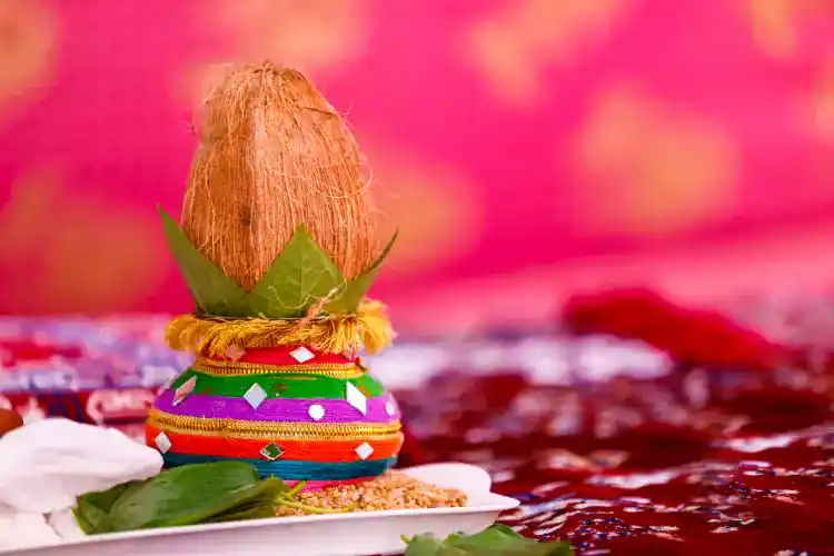 3. कलशाची स्थापना : कलशात गंगाजल आणि शुद्ध पाणी भरून त्यात सुपारी, नाणे, हळद, रोली ठेवावी. कलशाच्या तोंडावर आंब्याची पाने ठेवून लाल कापडाने सजवलेला नारळ ठेवावा.