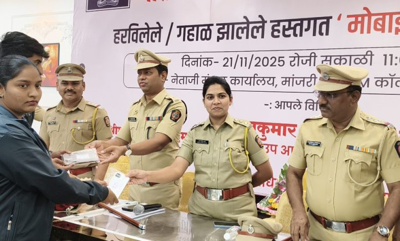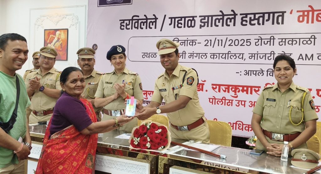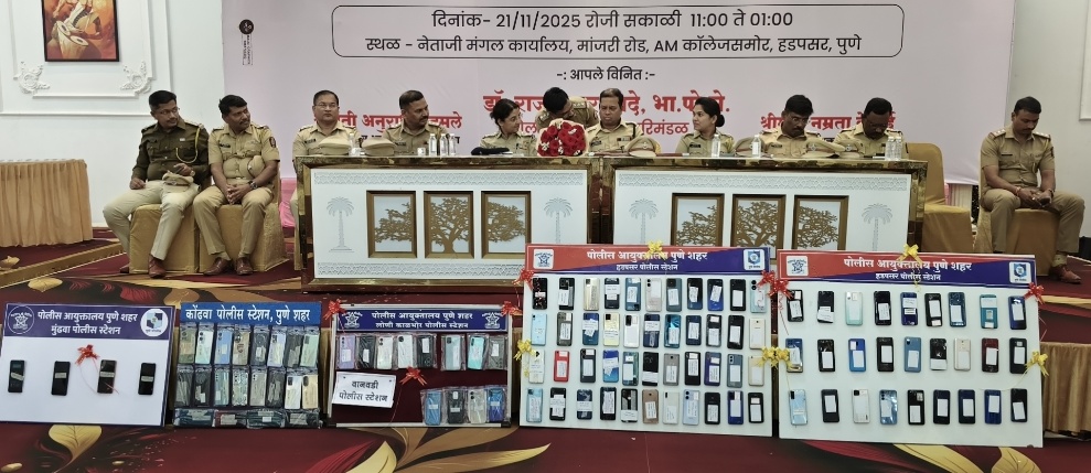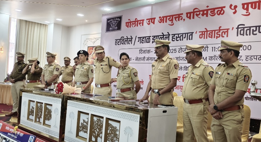 हडपसर (पुणे) : परिमंडळ ५ कार्यक्षेत्रामध्ये हरविलेले व गहाळ झालेले मोबाईल शोधून काढून ते त्यांच्या मालकांच्या हाती सुरक्षितपणे सुपूर्त करण्याचा उपक्रम आज प्रभावीपणे राबविण्यात आला. पुणे शहर पोलीस आयुक्तांच्या आदेशानुसार परिमंडळ स्तरावर हा उपक्रम २० आणि २१ नोव्हेंबर २०२५ रोजी राबविण्यात येणार होता, त्यानुसार आज हा विशेष कार्यक्रम यशस्वीपणे पार पडला.
