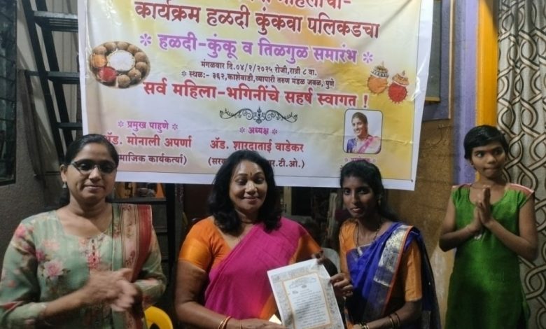 पुणे : नवविवाहित महिलांच्या पुढाकाराने विधवा महिलांना हळदी कुंकू कार्यक्रमाला बोलावून त्यांचा सन्मान करण्याचा अभिनव उपक्रम नेहा कांबळे व मोनिष कांबळे या दाम्पत्याने आयोजित केला होता.